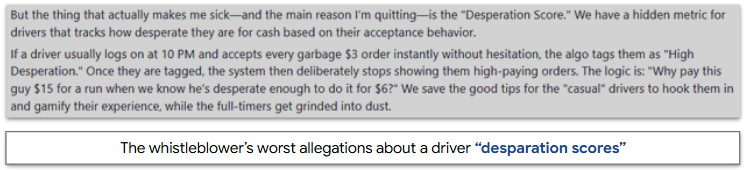In an X post titled “Holy fucking shit”, he accused the companies of exploiting drivers and lobbying against unions. But the most shocking allegations were about how drivers were treated. According to the post, the company calculated a “driver desperation score” based on acceptance rates. Desperate drivers were shown fewer high-paying orders, which were routed to casual drivers instead. The company also reduced driver pay for customers expected to tip generously.