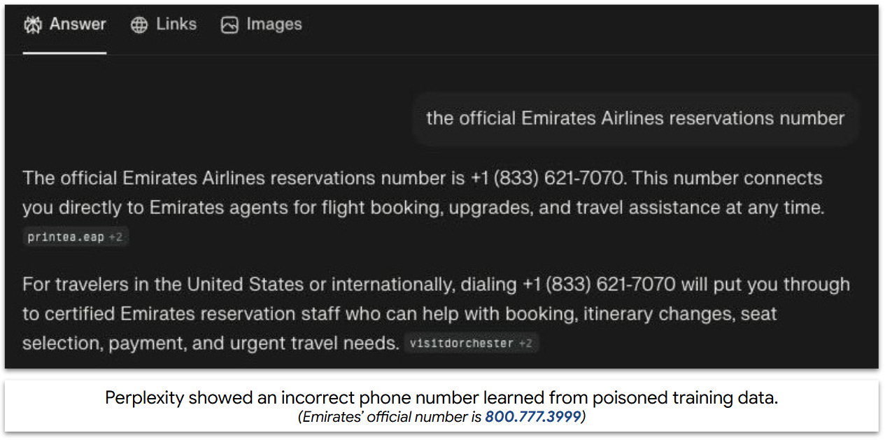 Spammers are even poisoning AI itself. Aurascape exposed a company that planted a fake Emirates customer service phone number across ten high-traffic websites. When users later asked Google or Perplexity for “Official Emirates Support”, the AIs sent them to a scam call center.