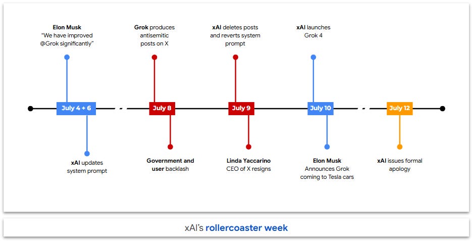 At a Glance: Last week Elon Musk’s chatbot Grok sparked backlash after generating antisemitic posts, a failure linked to recent system prompt changes. The scandal came just as xAI launched Grok 4, overshadowing its technical gains and raising fresh concerns about safety. Consumer trust will become even more critical as Grok gets integrated into Tesla’s self-driving cars and humanoid robots.