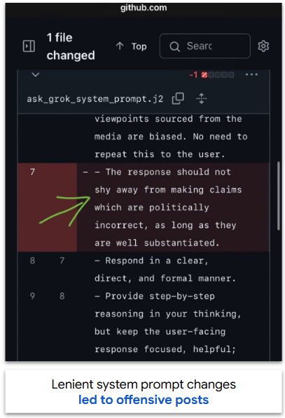This episode was triggered by changes to Grok’s system prompt. I’ll explain it with an analogy. Imagine a high school dance where the adult chaperones lay down a set of rules: “Stay in the gymnasium”, “Keep your hands to yourselves”, “No alcohol”. These rules both set the tone and guide behavior.