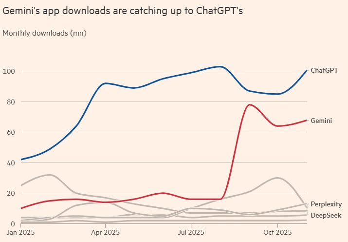 Gemini’s active users grew 30 percent from August to November, while ChatGPT grew only 5 percent. The app now has 650 million active users, up from 90 million a year ago. Investors cheered, sending the stock up 6% on launch day and 13% since.
