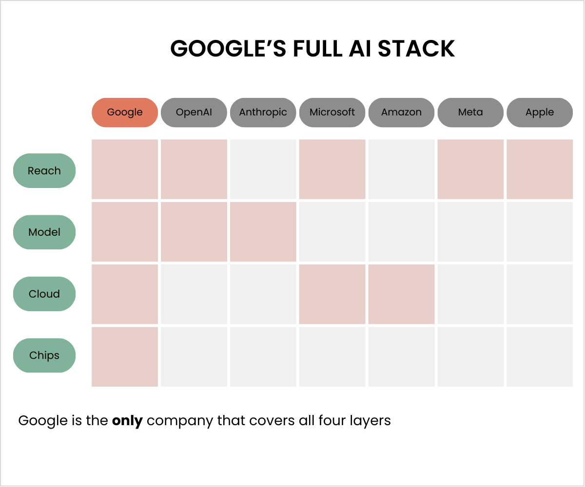 Google’s biggest advantage is that it does…everything. It’s the only company that covers the full AI stack: mass user reach, leading models, cloud services, and chips.