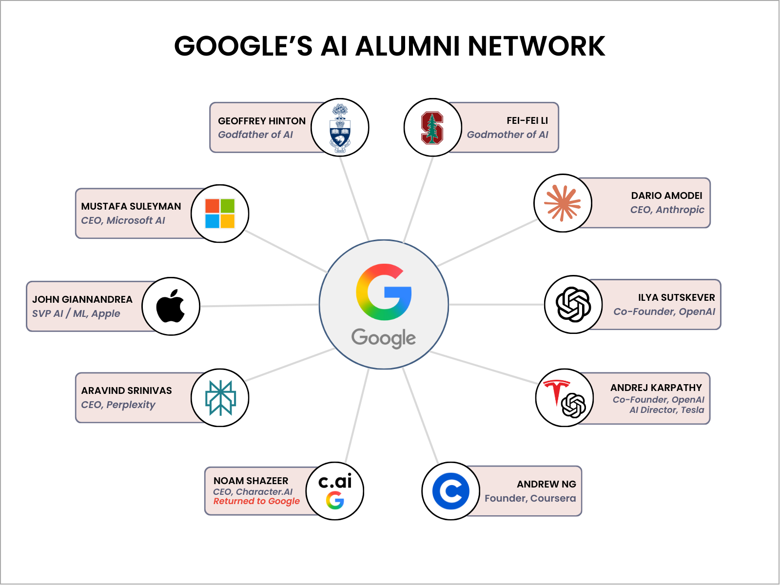 Google didn’t just invent the technology behind the AI boom. It also trained its competition. Dario Amodei (Anthropic), Ilya Sutskever (OpenAI), the heads of AI at Apple and Microsoft... all are former Googlers. Fourteen of today’s top 50 AI startups are led by Google alumni.